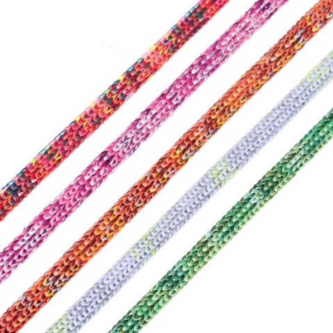 Knit cord with multi-color space-dyed yarn and ultra-soft tactility.