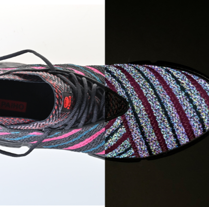 SPARTA strap-net shoe upper with air-permeable knit tape with grid textile structure and reflective yarn.