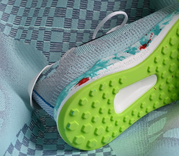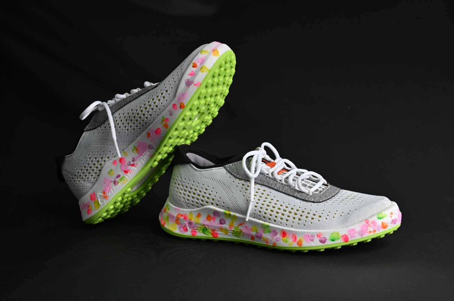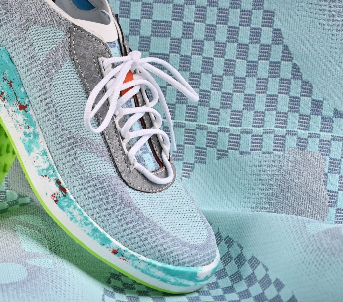 The continuously innovative warp-knitted mesh fabric pushes beyond traditional manufacturing limitations, showcasing multi-color expressions with a lightweight and soft hand feel. It highlights the vibrant colors and flexible softness of warp-knitted designs with artistically painted soles,